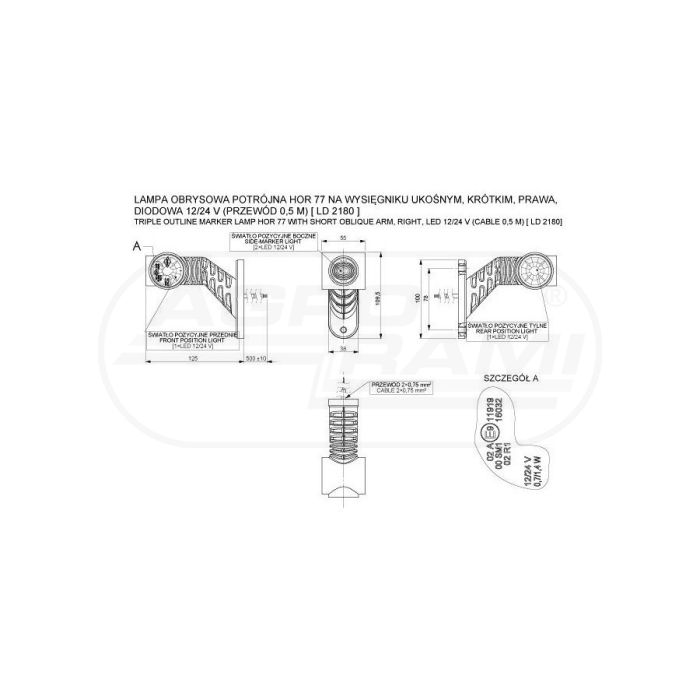 Lampa obrysowa potrójna Hor 77 prawa na wysięgniku ukośnym krótkim