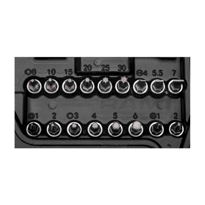 • 17x bity: SL4, 5.5, 7, T8, T10, T15, T20, T25, T30, PZ1, PZ2, PH1, PH2, H3, H4, H5, H6