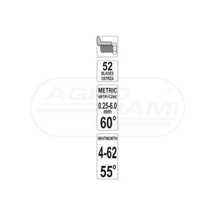Sprawdzian grzebieniowy do gwintów metrycznych 60° WHITORTH 55°, 52 szablony 4-62 BSW YATO 025 - 6,0 mm