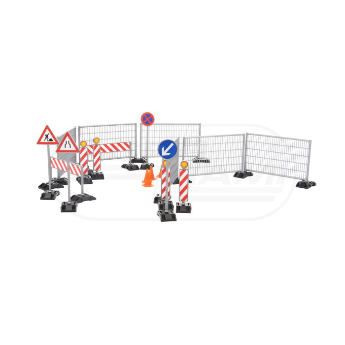 Zestaw akcesoriów budowlanych: ogrodzenia, znaki i słupy
